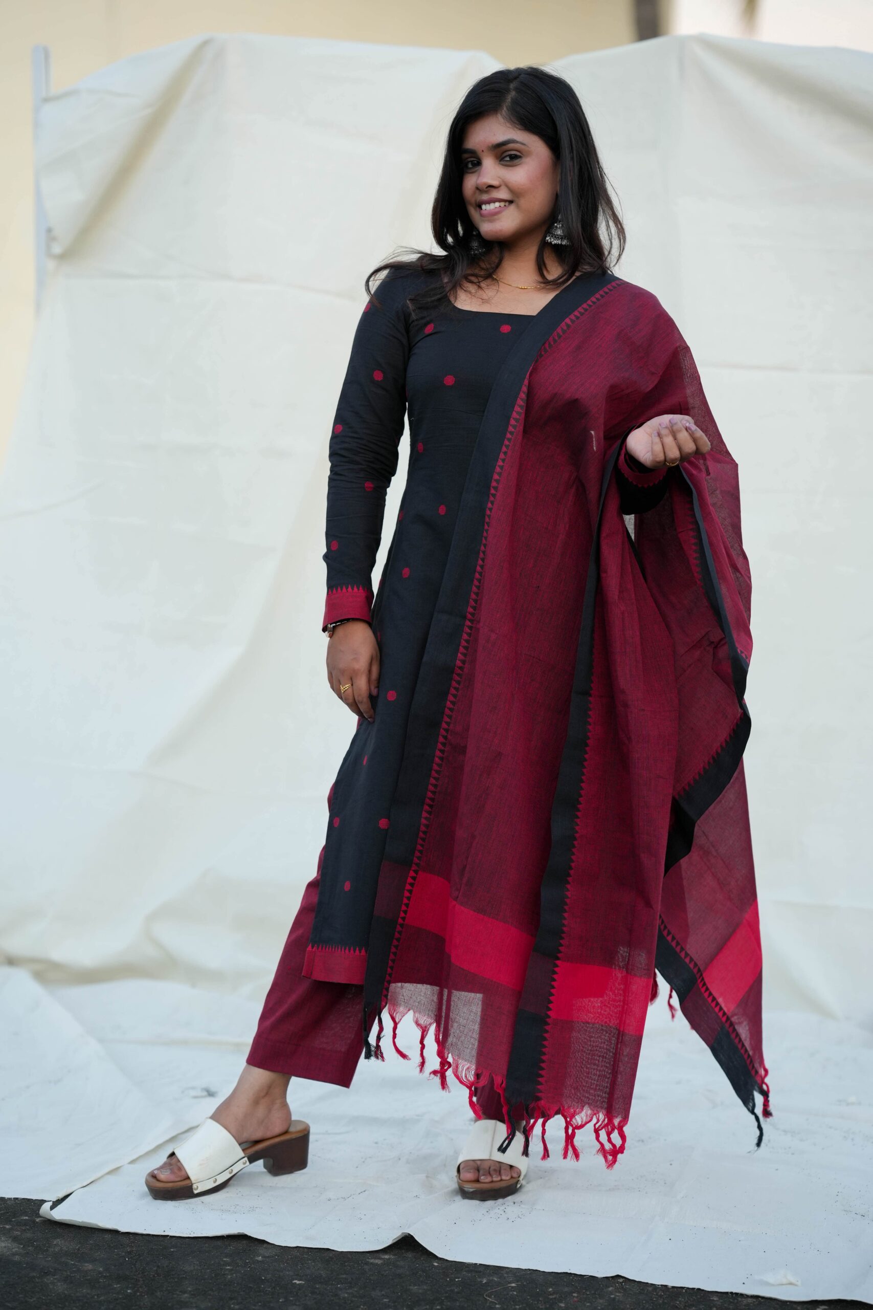 Experience everyday elegance with this comfortable cotton ensemble, tailored in a timeless salwar silhouette. Made from soft, breathable cotton, it ensures all-day comfort while maintaining a polished, traditional look. The classic cut offers ease of movement, making it perfect for both casual wear and semi-formal occasions. Subtle prints or delicate embroidery add a touch of charm, making this a versatile addition to your ethnic wardrobe.