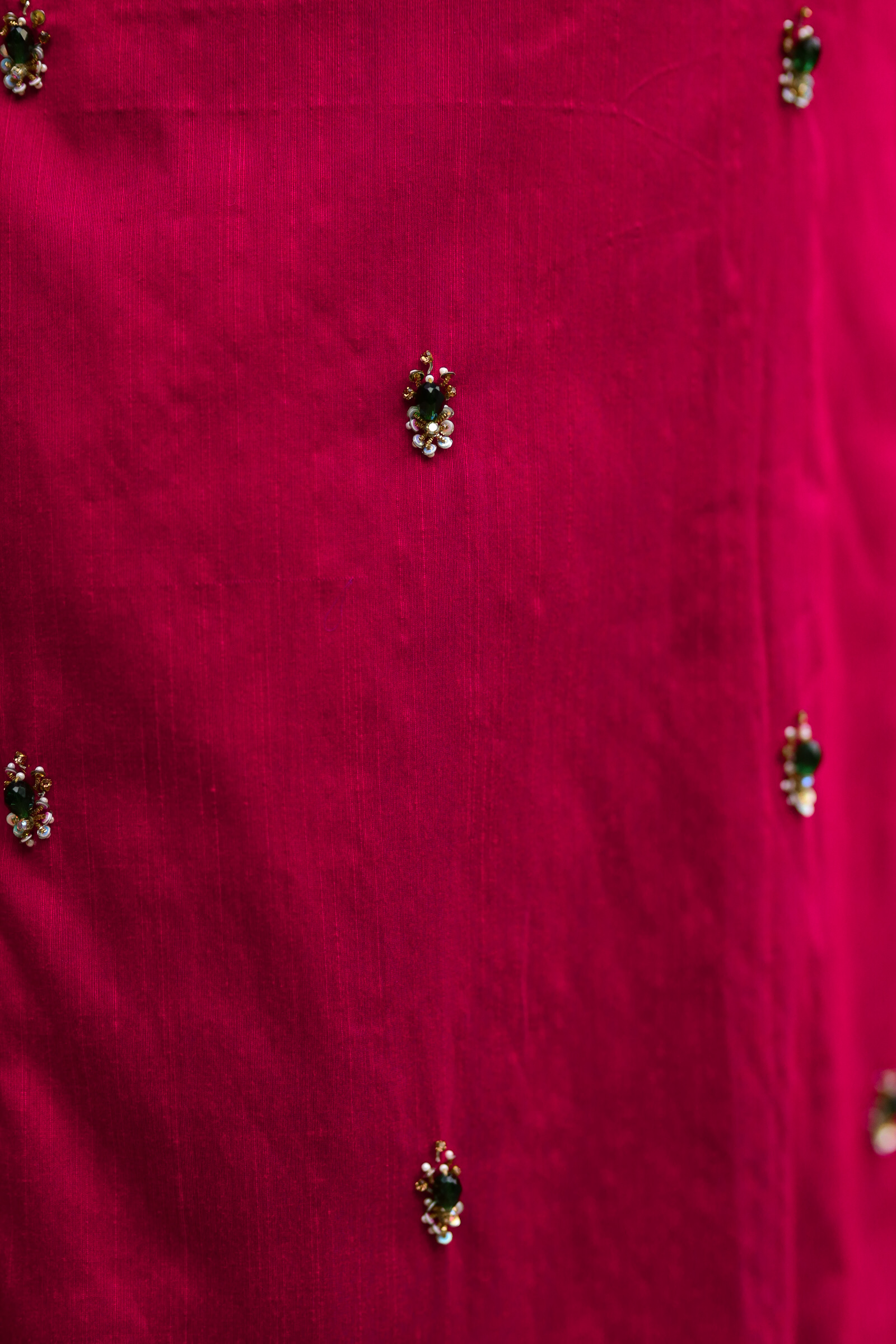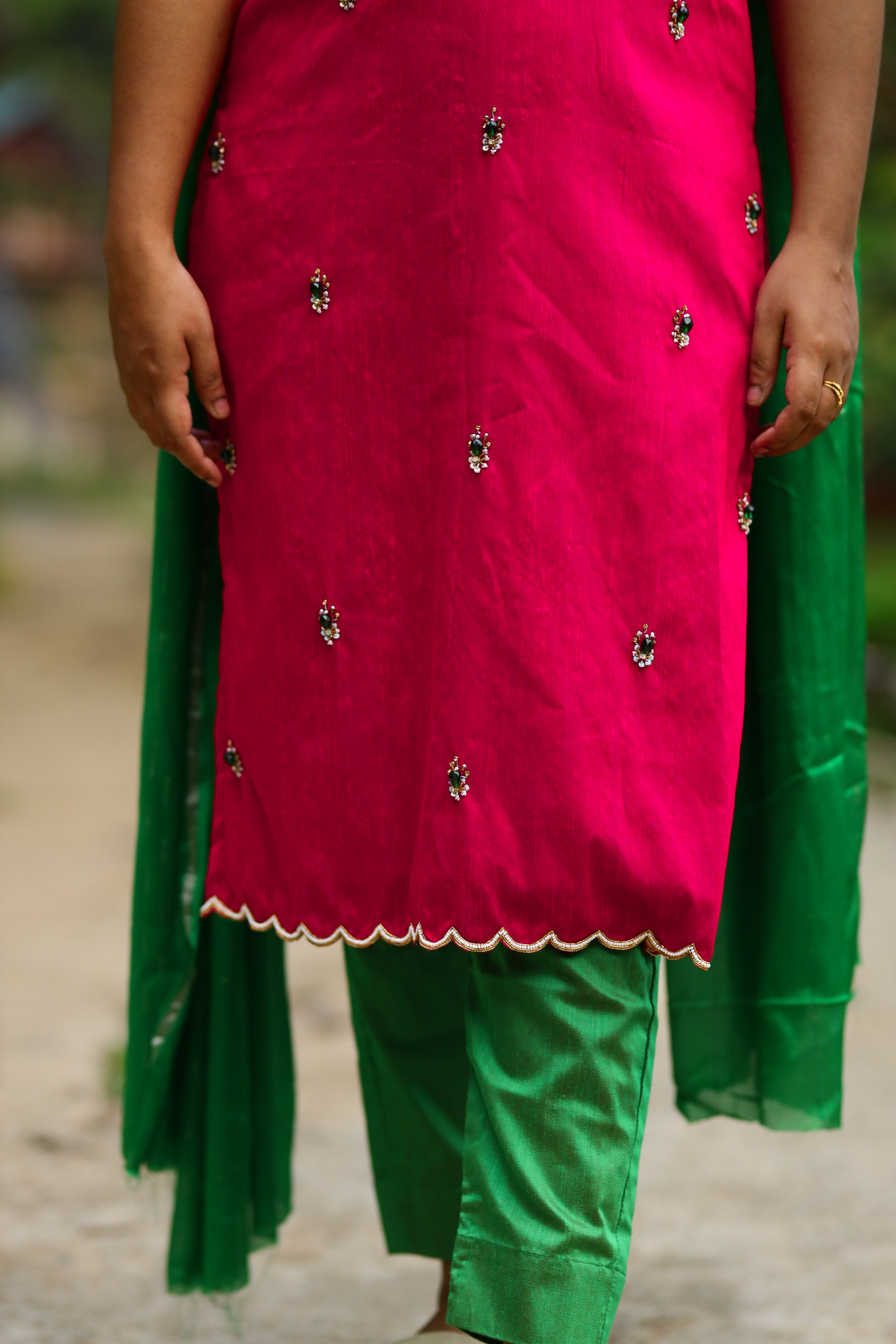 Handcrafted salwar suit in deep pink and rich green tones”