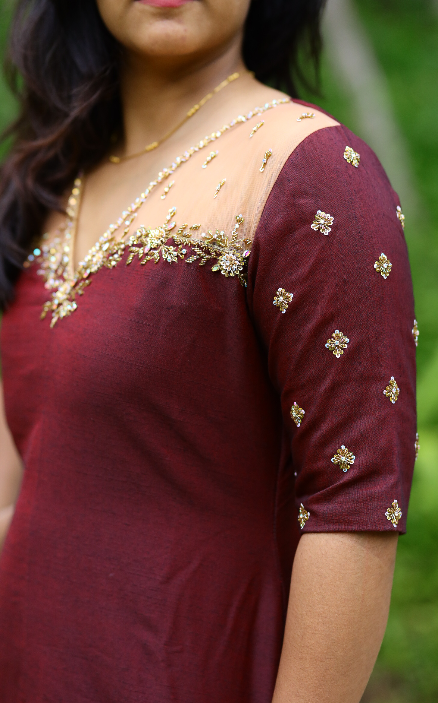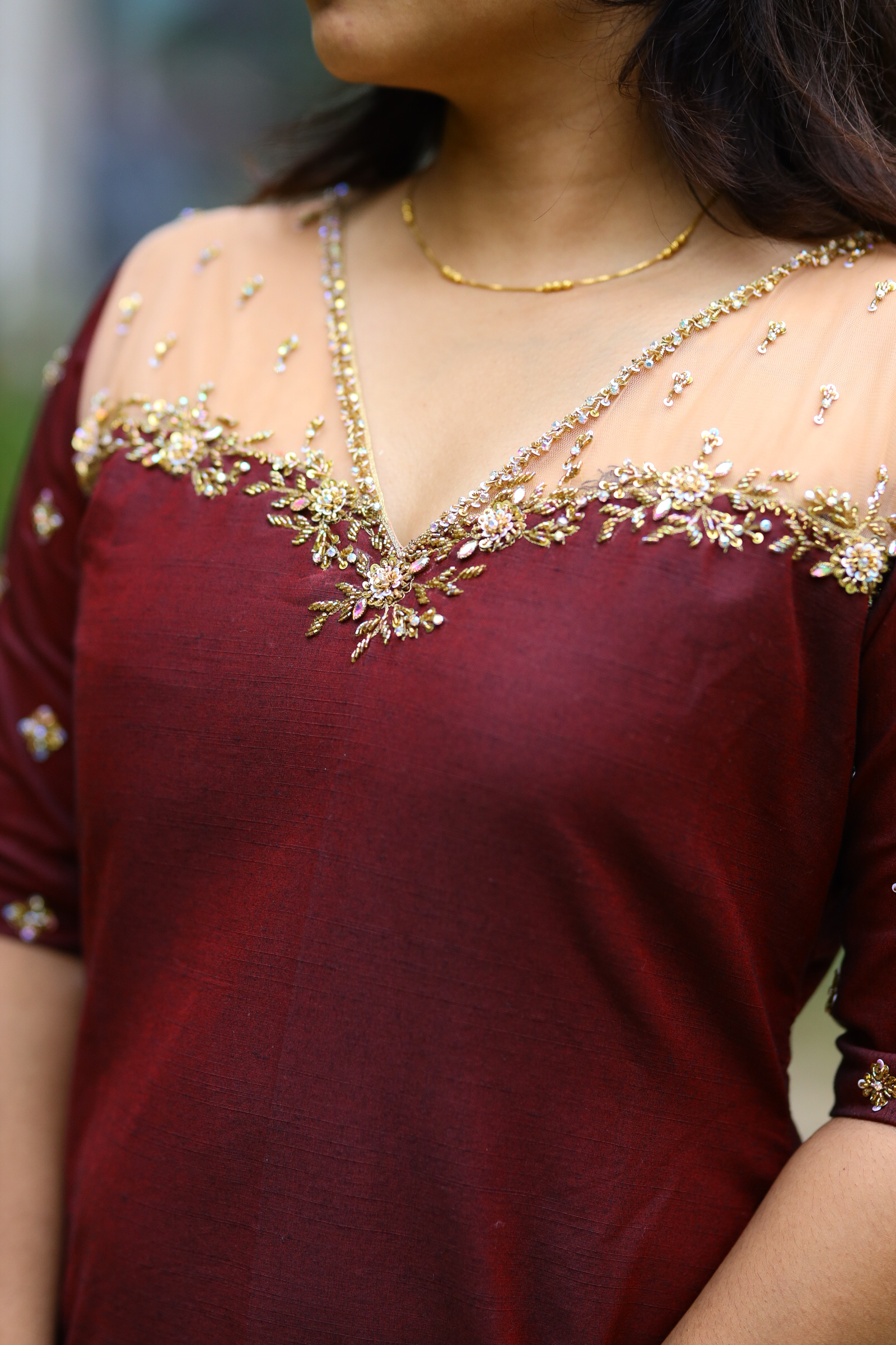 Rich maroon fabric adorned with artisanal handwork and sheer net elements
