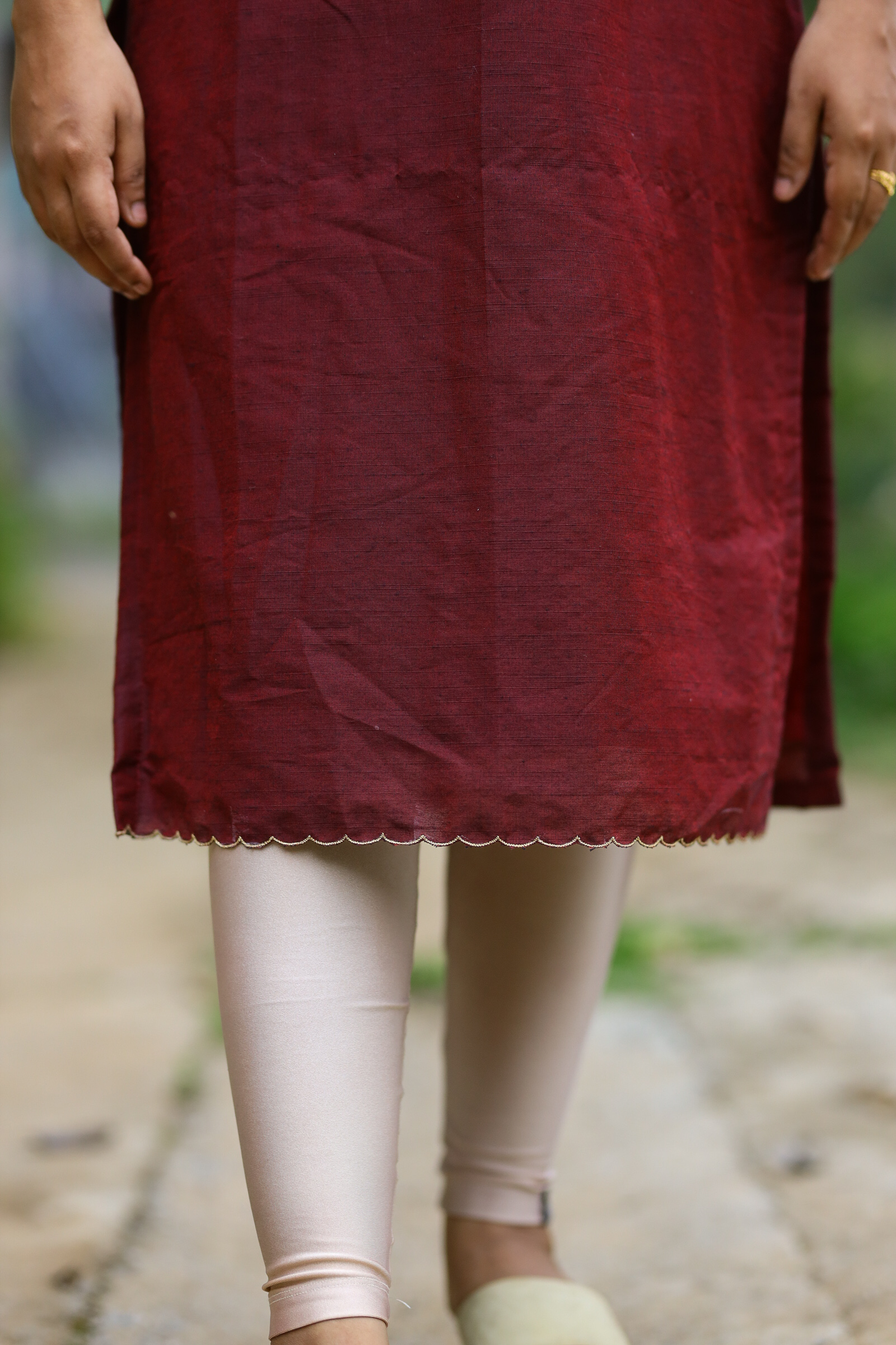 Exude timeless elegance in this rich maroon ensemble, thoughtfully crafted with artisanal handwork that highlights traditional craftsmanship. The deep, luxurious maroon fabric sets a regal tone, while intricate embroidery adds texture and visual depth. Delicate net elements are seamlessly integrated, lending a soft, ethereal contrast to the richness of the base fabric. Perfect for festive celebrations, weddings, or evening occasions, this piece strikes the perfect balance between opulence and subtle sophistication.